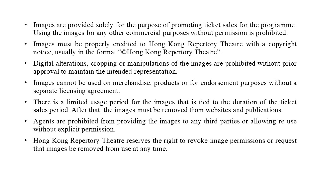 If you need to use the programme content and images, you may download them by clicking on the images below and please follow the photo usage instructions of the Hong Kong Repertory Theatre. Click Here to read the guidelines.