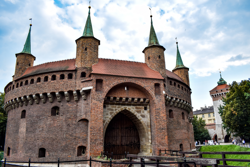 克拉科夫作为一座皇都,除了宫殿外,防御工作同样重要,因此,在古城区入口,自然会有城墙守卫。现在的城墙经历多少战火後,所剩无几,不过,却在入口处,留下了瓮城这一城堡状的城门。