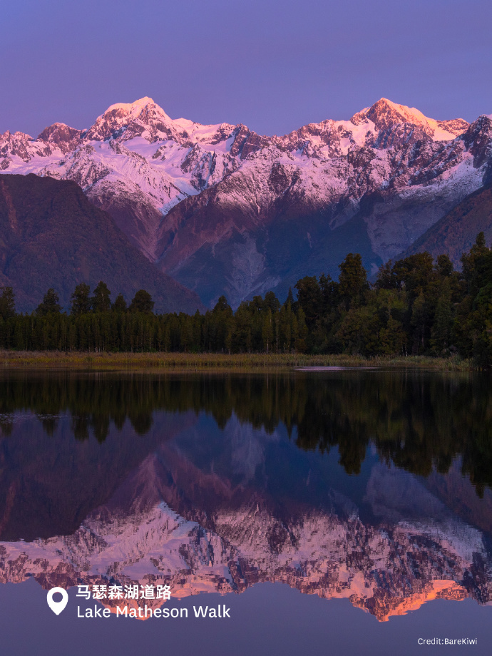 The area is famous for the stunning water reflections of Lake Matheson, also known as Mirror Lake. The surface of the water is a clear reflection of New Zealand's tallest mountain, Mount Cook, and is best viewed at dawn or dusk when the golden light of dawn or sunset falls on the calm surface of the lake, perfectly framing the magnificence of the mountain and its surroundings.