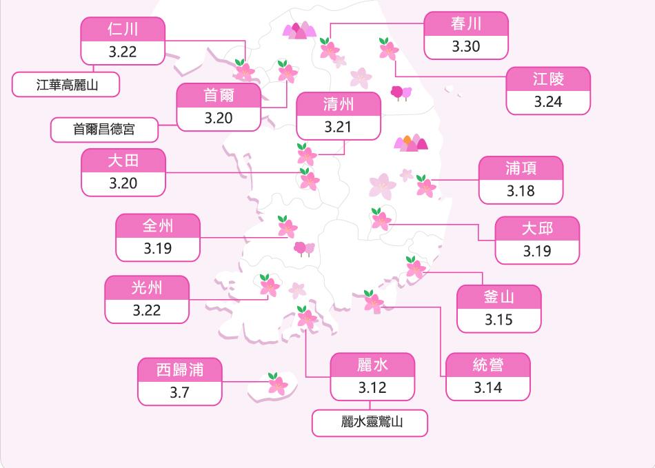 彷彿絕不讓步的冬季刺骨寒風隨著春天的到來漸漸衰退,熬過寒冬的樹木紛紛綻放明媚的花朵,傳遞著春日到來的訊息。迎春花、杜鵑花、櫻花等是對韓國人而言最熟悉的春季花卉,他們的存在也宣告著韓國春季的到來。其中迎春花與杜鵑花的開花時期相近,總爭先恐後地告知大家春天的開始。各種春花一朵一朵綻放時,花朵雖小、顏色也不夠鮮亮,給人纖弱的印象;但一整片盛開時,能讓人感受到滿滿的、躍動的春之能量。
