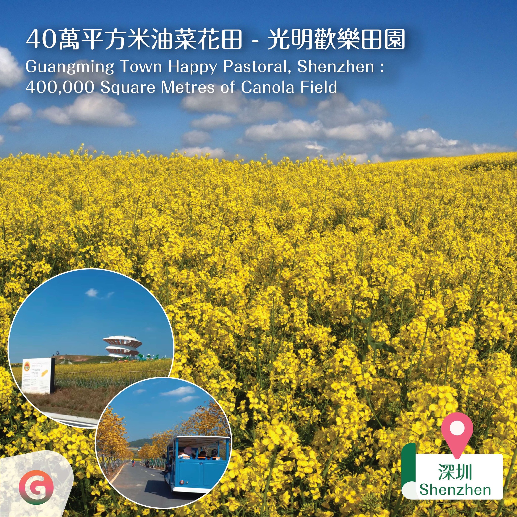 正直初春百花齐放,属於粤港澳大湾区的深圳,市内各区花田陆续争妍斗丽,当中位於深圳的光明欢乐田园油菜花田较为突出,成为国内网红打卡热点首选
