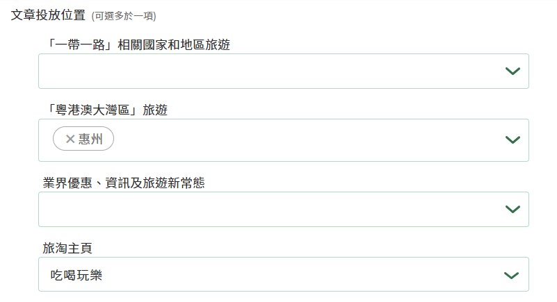 為了最準確地將您的文章/產品傳遞給您的目標受眾,選擇正確的版塊來發佈您的文章是非常重要。 例如,如文章或產品是關於惠州,您可以選擇「粵港澳大灣區」旅遊部份並選擇“惠州”。 文章/產品將顯示在正確的相關頁面。 |