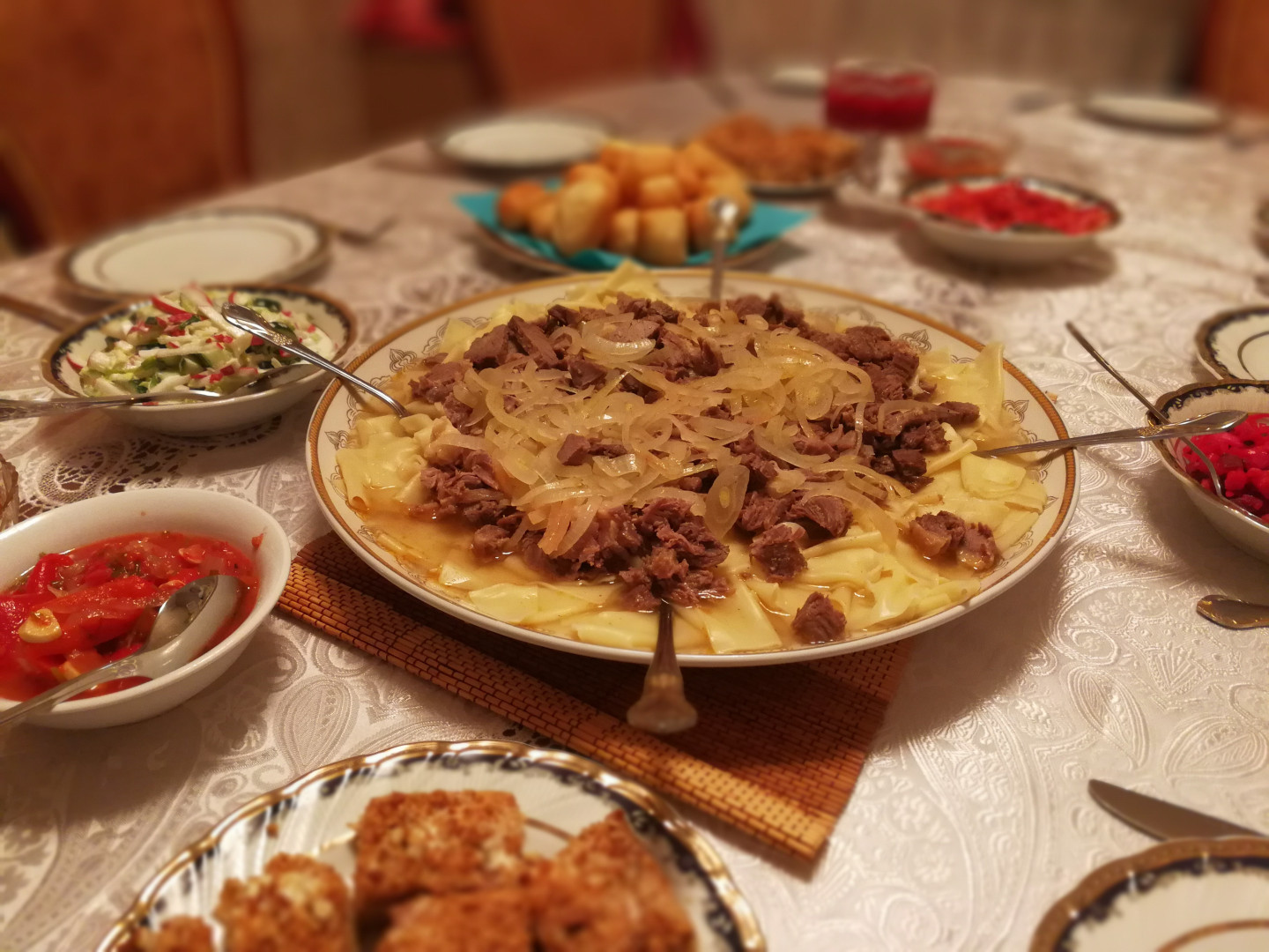 今次到訪阿拉木圖,跟團隊的導遊一見如故,幾天時間就經已打成一片,她更一盡地主之誼,邀請我們到她家作客,我們也二話不說應邀了。要深入瞭解當地文化,最直截了當莫過於到訪當地人的家。所以完成當日行程後,我們一行八人傍晚到她家,導遊的家人已經為我們悉心準備了滿桌的「九大簋」,映入眼簾的是一大盤馬肉料理。在香港生活的我們鮮吃馬肉,大家也十分好奇馬肉的味道到底如何。導遊闡述昔日馬背上的哈薩克民族要外出征戰,馬除了是主要的交通工具,也是哈薩克族牧民補充能量的主食。時至今日,大部分家庭平日煮飯未必會吃馬肉,但大時大節或家中有重要賓客到訪,這傳統仍會保留,馬肉菜式定當出現,看來我們這班貴賓今次口福不淺。
