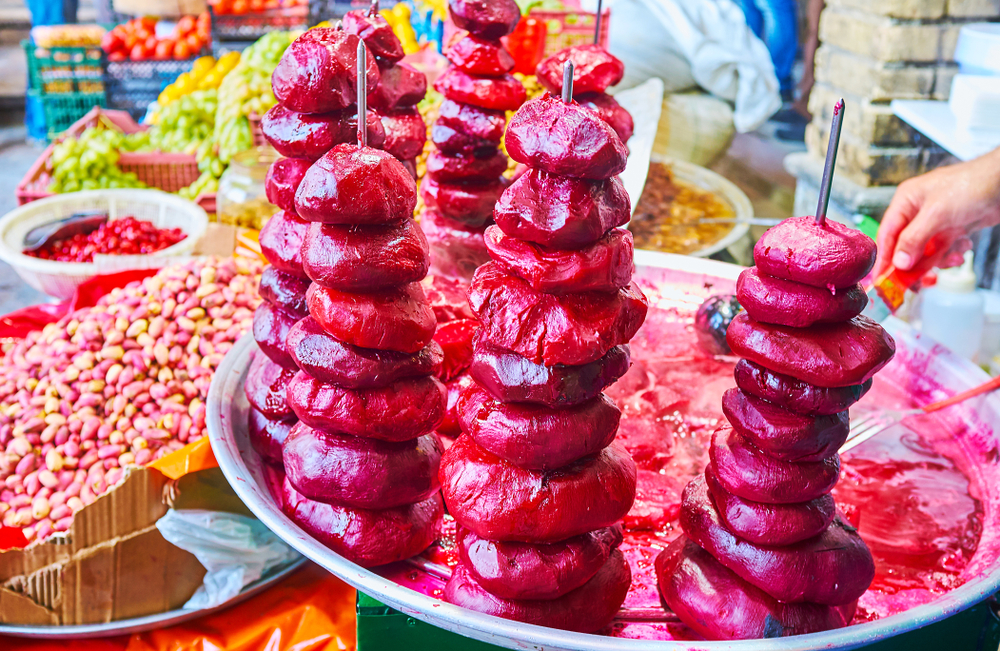 在大巴扎熟食攤檔能買到的紅菜頭串串,外形有點像冰糖葫蘆。